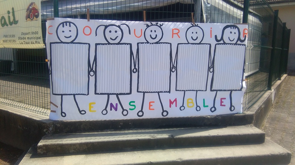 En fonction du nombre de tours de stade effectué, nous avions à coller des étiquettes pour compléter notre affiche "COURIR ENSEMBLE".